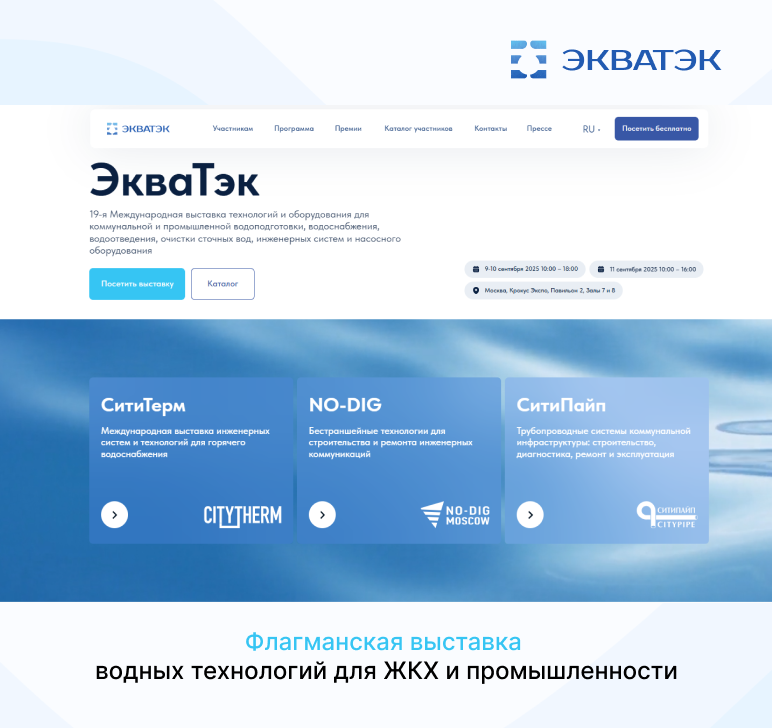На новом сайте — чистый дизайн, лёгкая навигация и насыщенные акцентные цвета, вдохновлённые глубинами воды. Логотип стал более лаконичным, но сохранил узнаваемость — теперь он работает как чёткий знак качества и лидерства в отрасли. Цветовая гамма логотипа — глубокие и чистые оттенки синего — отражает доверие, надёжность и технологичность. Это не просто знак, а маркер качества, который будет сопровождать ЭкваТэк на каждой выставке.